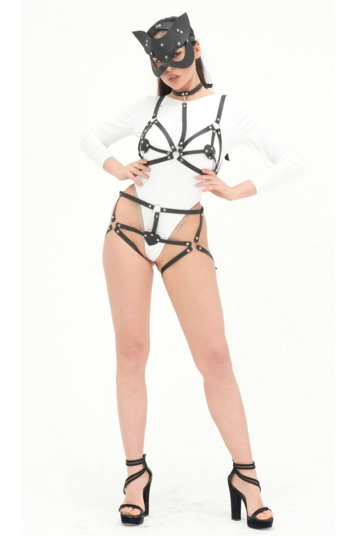 • Belden Tutturmalı Maske Sütyen Ve Jartiyerli Sexi Fantezi Deri Kostüm 800174