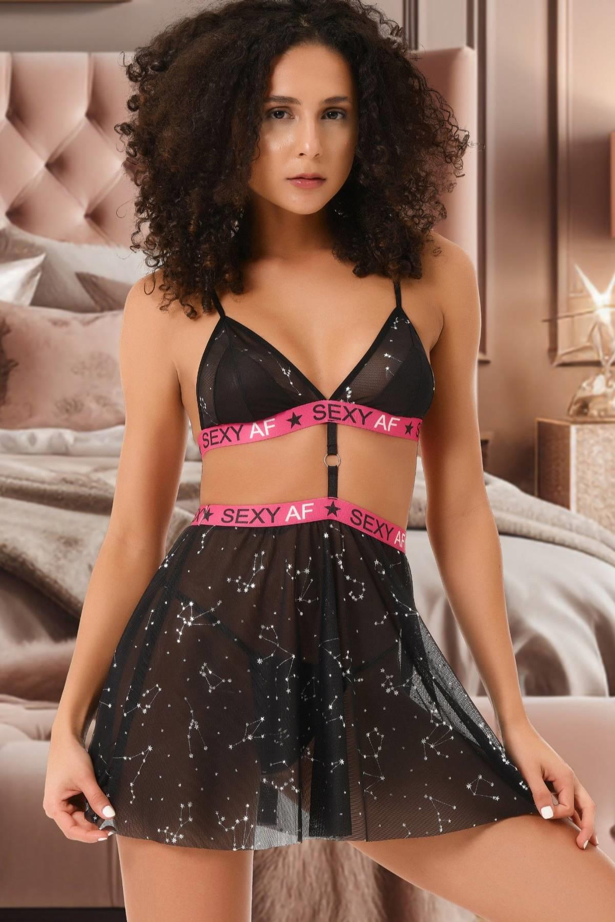 Tül Üstüne Baskılı Şık Sütyen Külot Etekli Sexy Yazılı Gecelik 51231